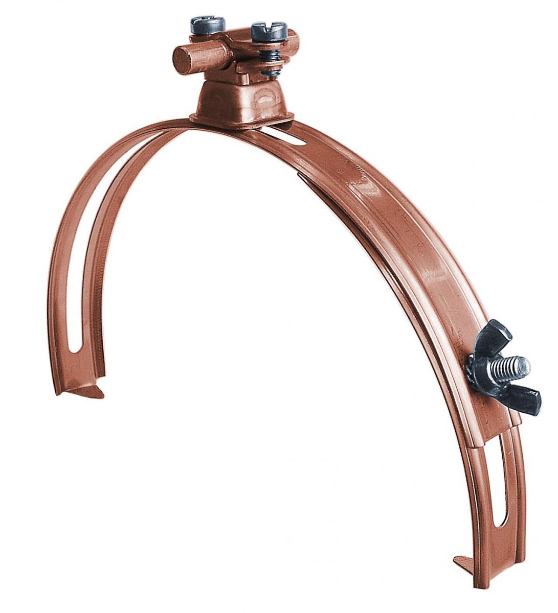 Uniflex-First-Bügel für Leitung 8mm,18mm Leitungshöhe,mit CU-Überleger klemmend.Für Firstziegel Basis 170-240mm.Mit Metall- Sockel verk.VA-Mutter-und Zahnscheibe.CU