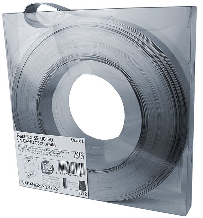 25m V4A-Band Abmessung 25x0,4mm,aufgerollt in Kassette,zum Ablängen nach Bedarf, für große Rohrschellen.Ca.2,5kg Bandmat. 1m=100g