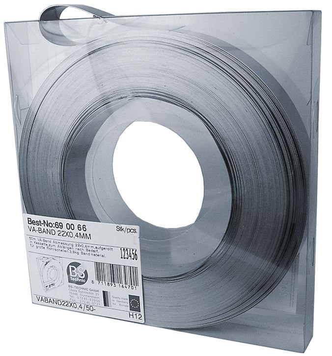 50m VA-Band Abmessung 22x0,4mm,aufgerollt in Kassette,zum Ablängen nach Bedarf, für große Rohrschellen.3,5kg Bandmaterial.